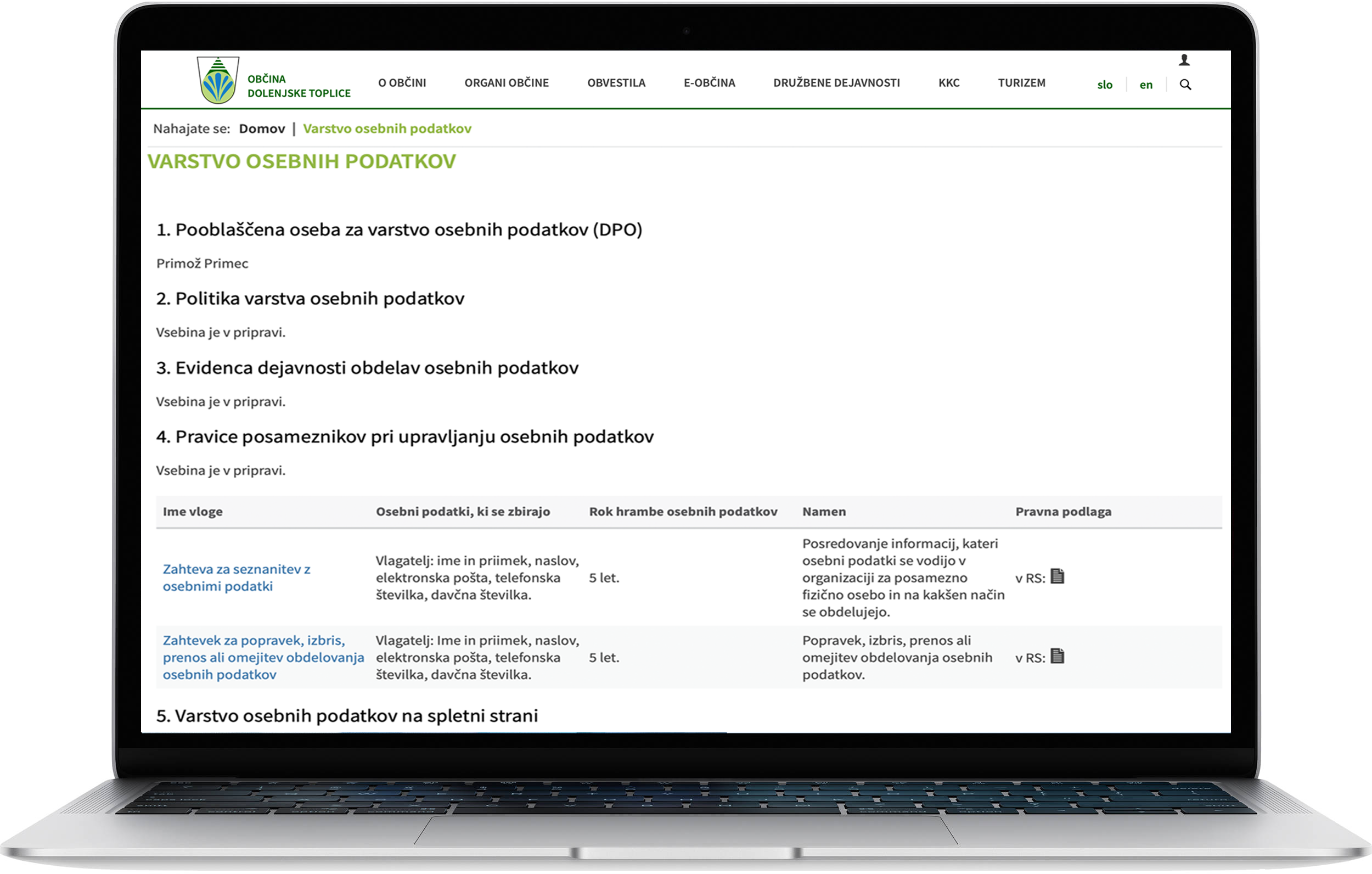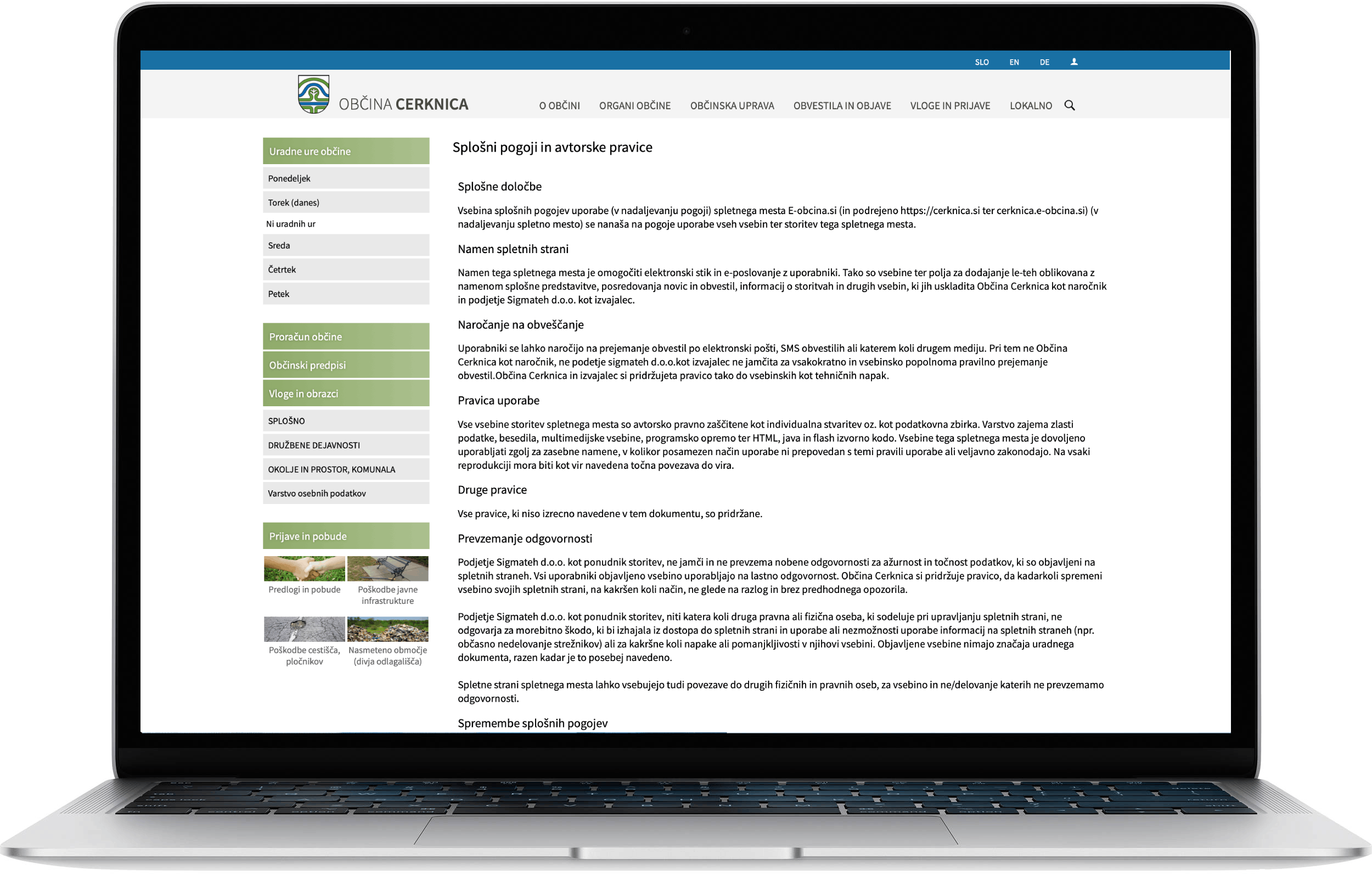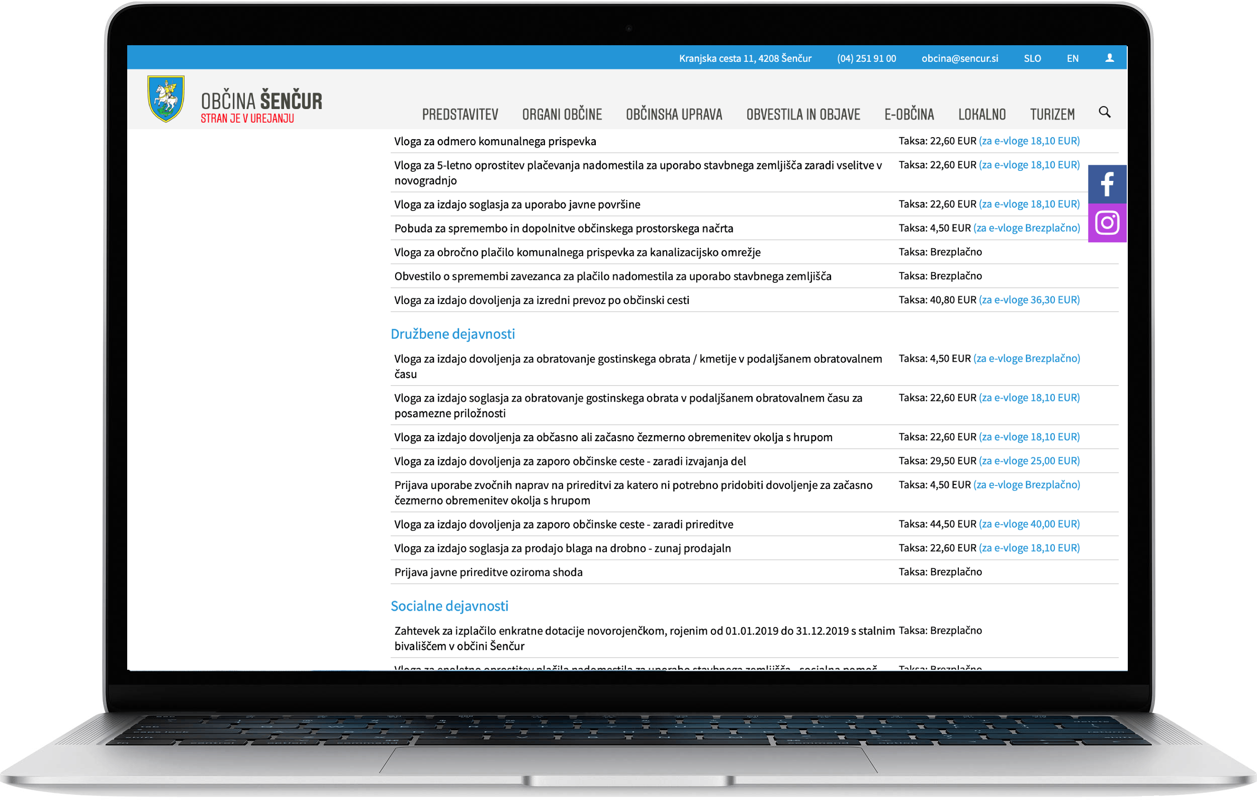 Spletna stran e-občina kot edina spletna stran v Sloveniji omogoča celovit e-stik občine z občani z e-vlogami, spletnim plačevanjem taks, SMS in e-mail obveščanjem občanov, predlogi in pobude občanov, katalog informacij javnega značaja... Za zakonsko skladnost so pripravljeni splošni pogoji in avtorske pravice, center za varstvo osebnih podatkov, pogodbe o obdelavi osebnih podatkov, pravilniki in politike zasebnosti...
