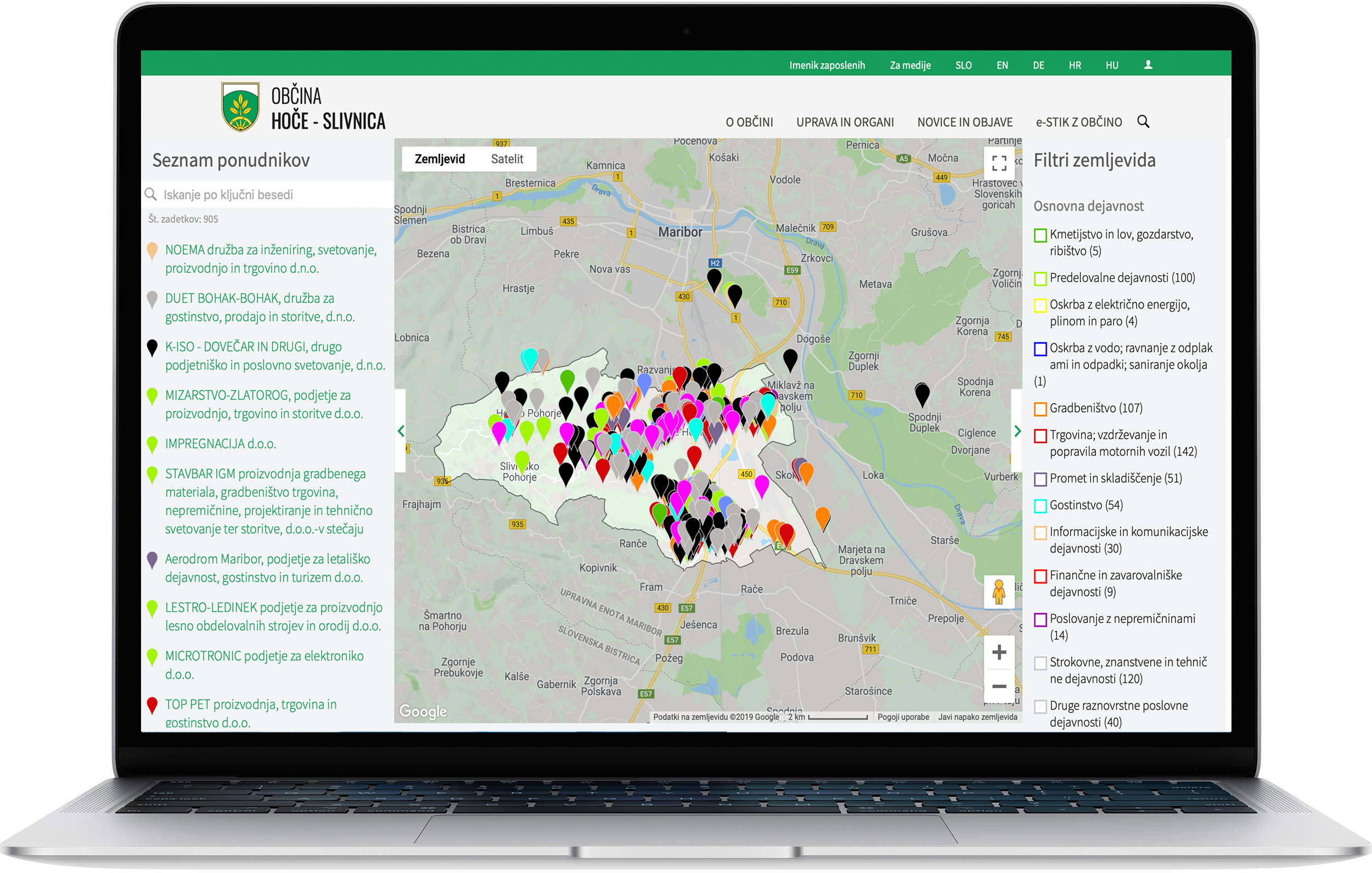 Modul omogoča prikaz seznama vseh lokalnih ponudnikov v občini na interaktivnem zemljevidu. Omogočeno je filtriranje ponudnikov glede na dejavnost (različno obarvane točke), glede na leto ustanovitve, število zaposlenih…