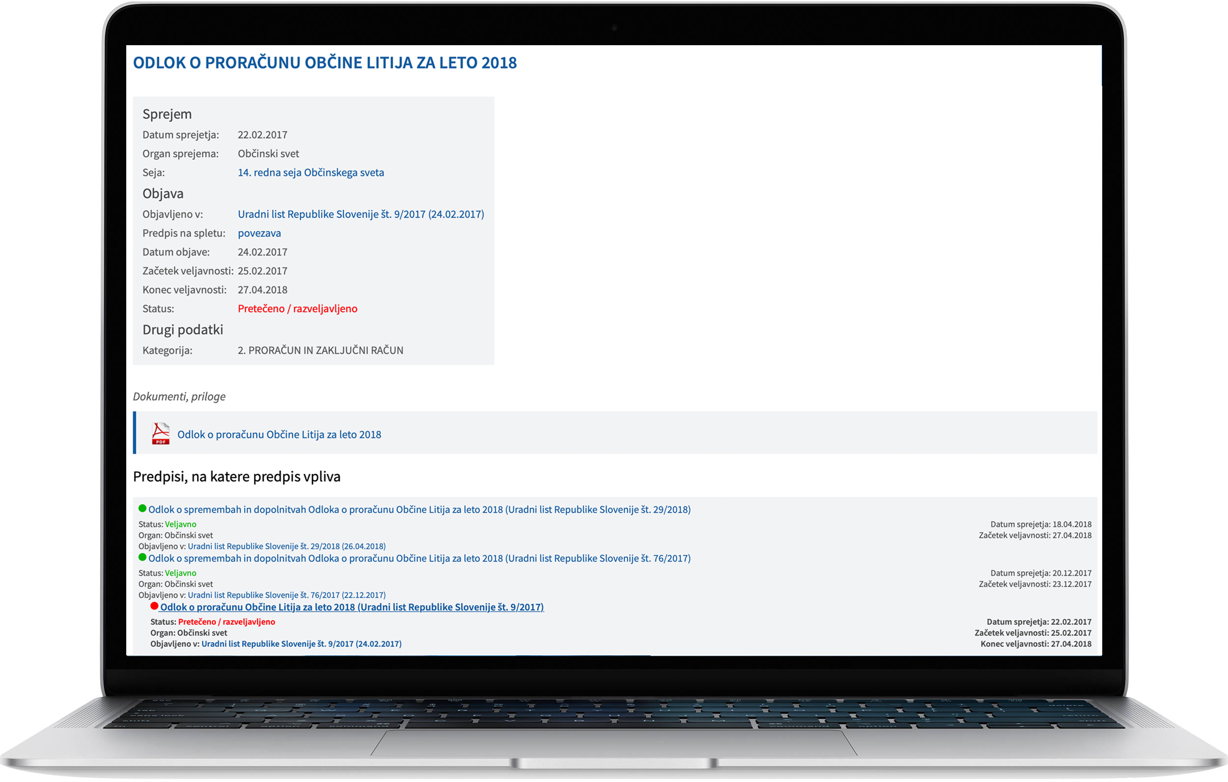 Objava vseh predpisov na spletni strani občine zagotavlja transparentnost poslovanja občine, saj omogoča napredno iskanje po predpisih, predpisi pa so v zavihkih grupirani po statusu sprejetja. Za vsak predpis si je mogoče ogledati podatke o sprejemu predpisa, morebitne priloge na predpisu (npr. grafični del) in kronologijo predhodno sprejetih predpisov. Svetniki si lahko pred vsako sejo ogledajo predvidene predpise za sprejem, naknadno pa je vidno za vsako sejo kateri predpisi so bili na seji obravnavani. Ob vsakem vnosu predpisa se določi vsebina predpisa in se tako avtomatično generira še razvid predpisov - prikaz predpisov po vsebini.